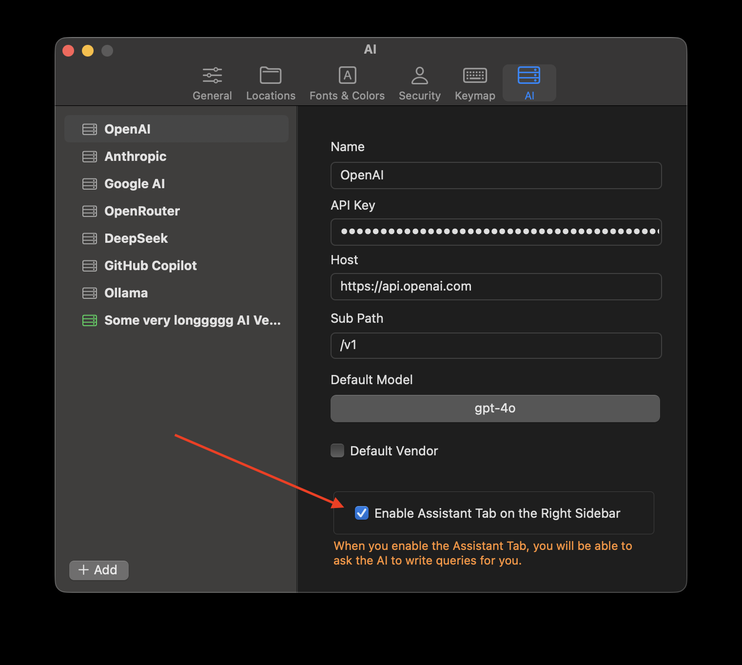 So the security is entirely dependent on your setup. If you block access to the LLM vendors, the TablePlus plugin will not work. The query that TablePlus sends to the LLM depends on your configuration—you can point it to OpenAI, Anthropic, Github Copilot... or a local LLM instance.